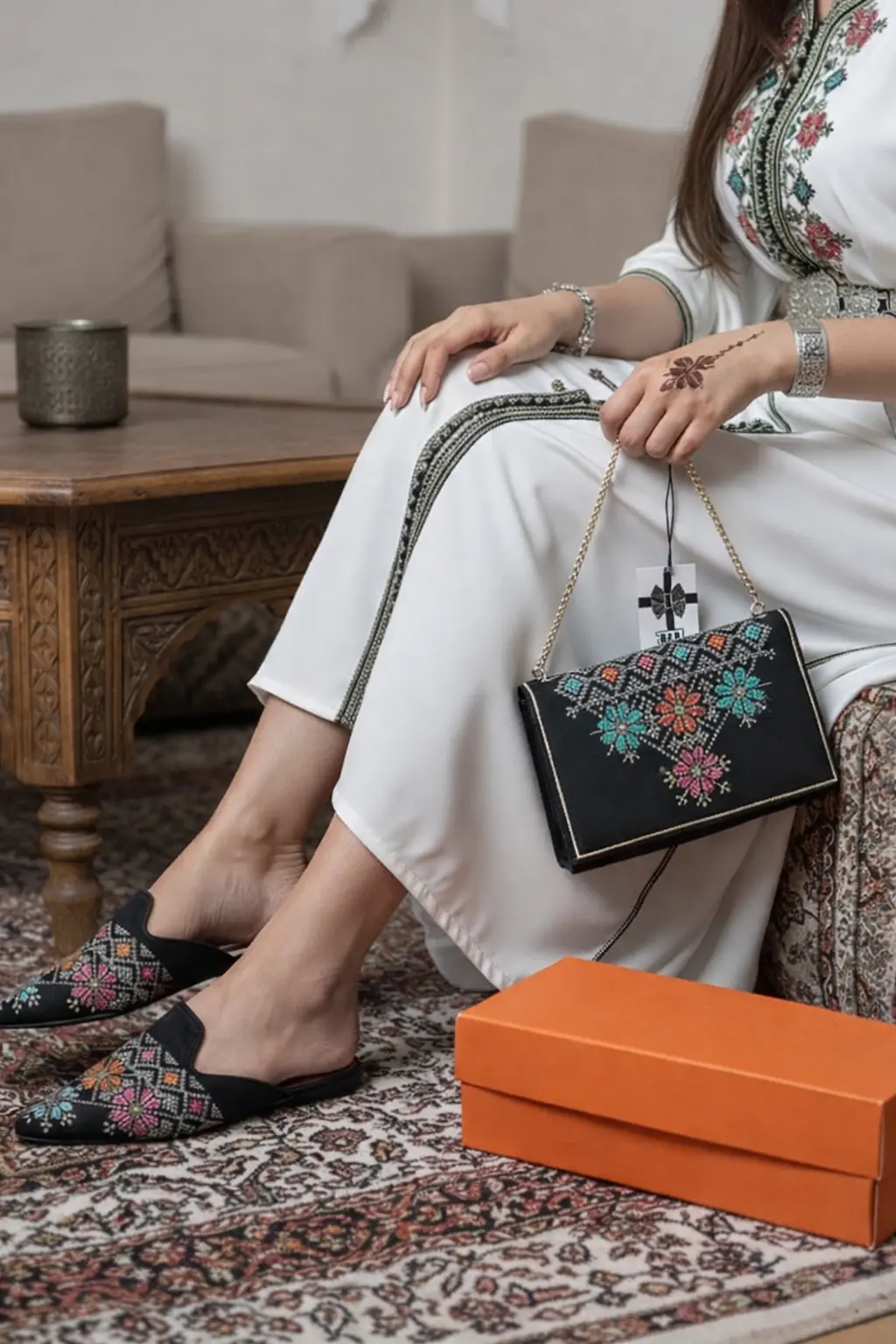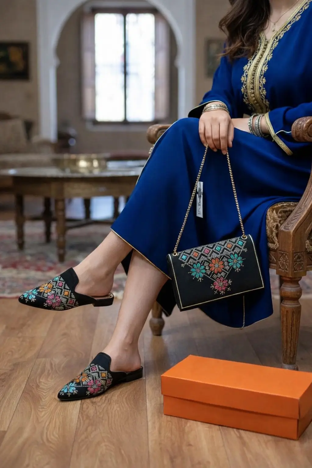 أضيفي لمسة من الأناقة المغربية الأصيلة لإطلالتك مع هذا الطقم المميز الذي يجمع بين صاك أنيق وبلغة مزينة بالطرز الرباطي التقليدي.